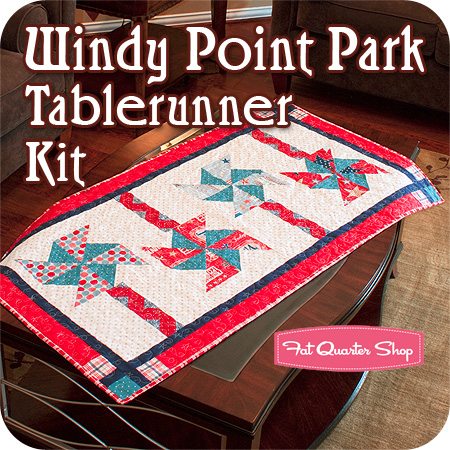 Introducing the Windy Point Park table runner made with Stars & Stripes by Mind’s Eye for Riley Blake–did I mention these fabrics are really a lot of fun…I already have a few things in mind for my scraps! Kits and the fun pattern available here at the Fat Quarter Shop.