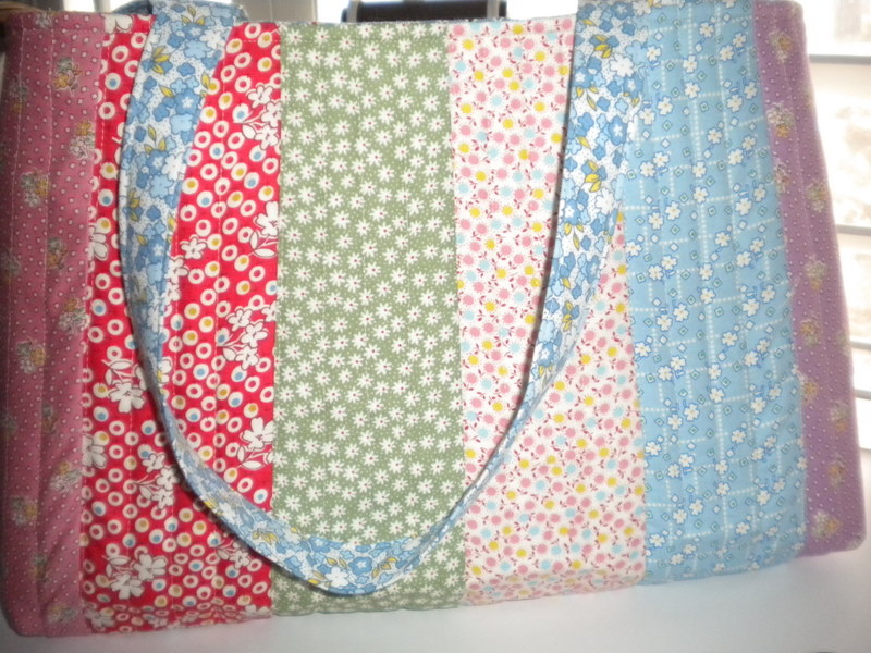 One of the last Christmas gifts I finished last week…my Mom wanted a bag made with reproduction 30’s fabrics. It turned out really cute…it was raining like crazy outside, so I had trouble getting a good picture. I literally finished this, packed it up, and sped to the post office to get it out in time!