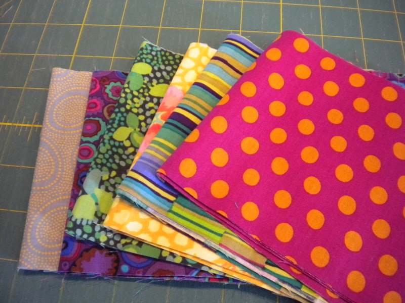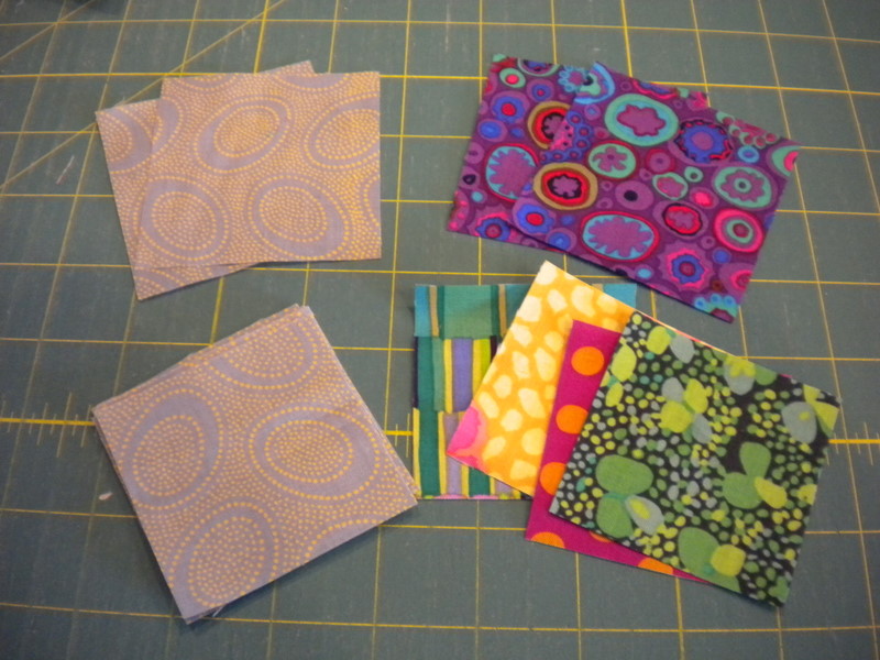 - 4 – 2 ยฝ” squares of medium/dark prints (I used four different Kaffe prints–you could make them all the same or use two each of two different prints).