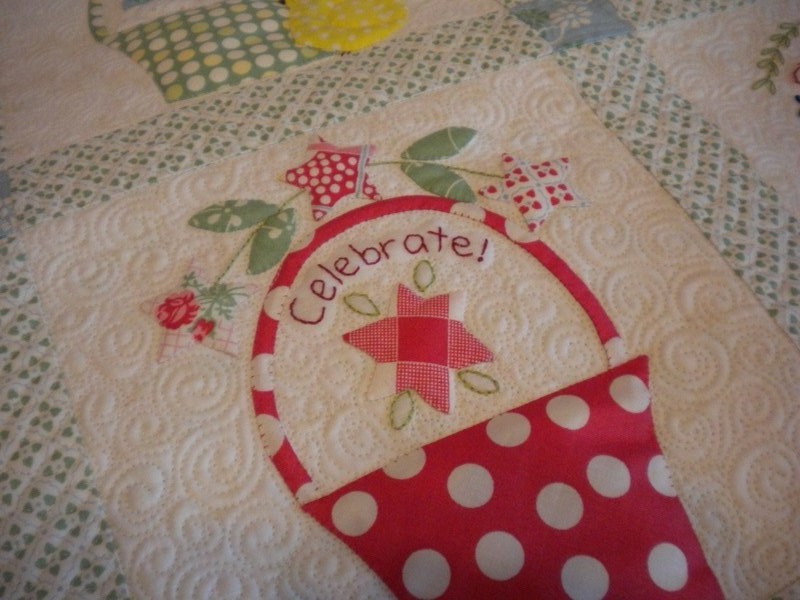 You must be tickled pink to have your Tisket-a-Tasket quilt back and the quilting Judi did is lovely… perfect complement to the beautiful work you did.