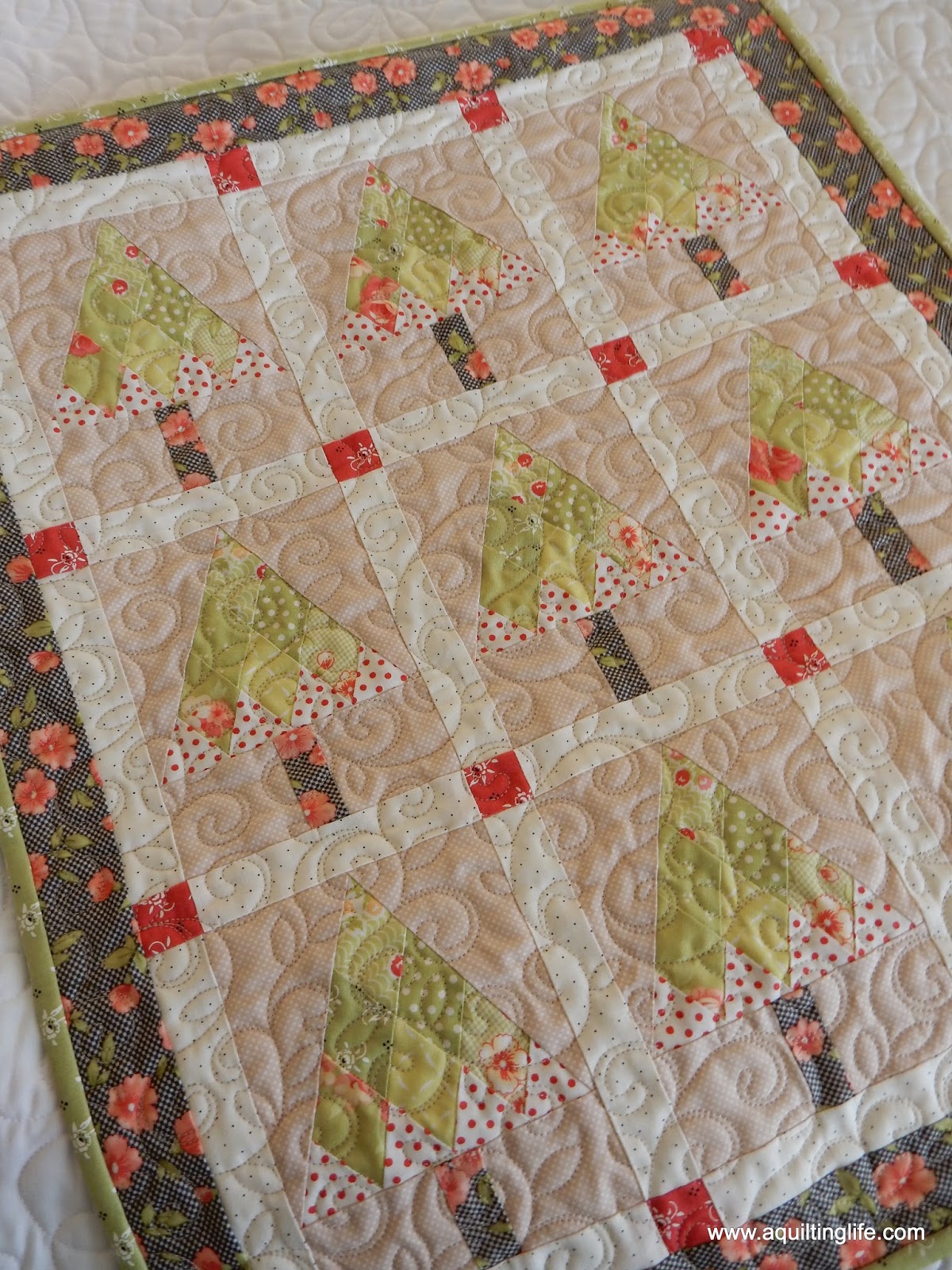I just love the swirly design with leaves that my friend Marion quilted on it!