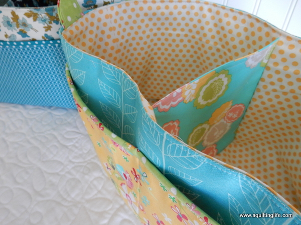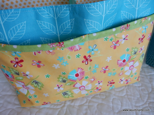 The pattern is easy to follow and very well designed. The interior section has a divider which really makes it nice for organization purposes. For my daughter’s basket I used a mix of fabrics…the blue leaf by V & Co., the yellow floral, green floral, and aqua floral from Prairie by Corey Yoder, and the yellow polka dot from Bright Sun for the lining.