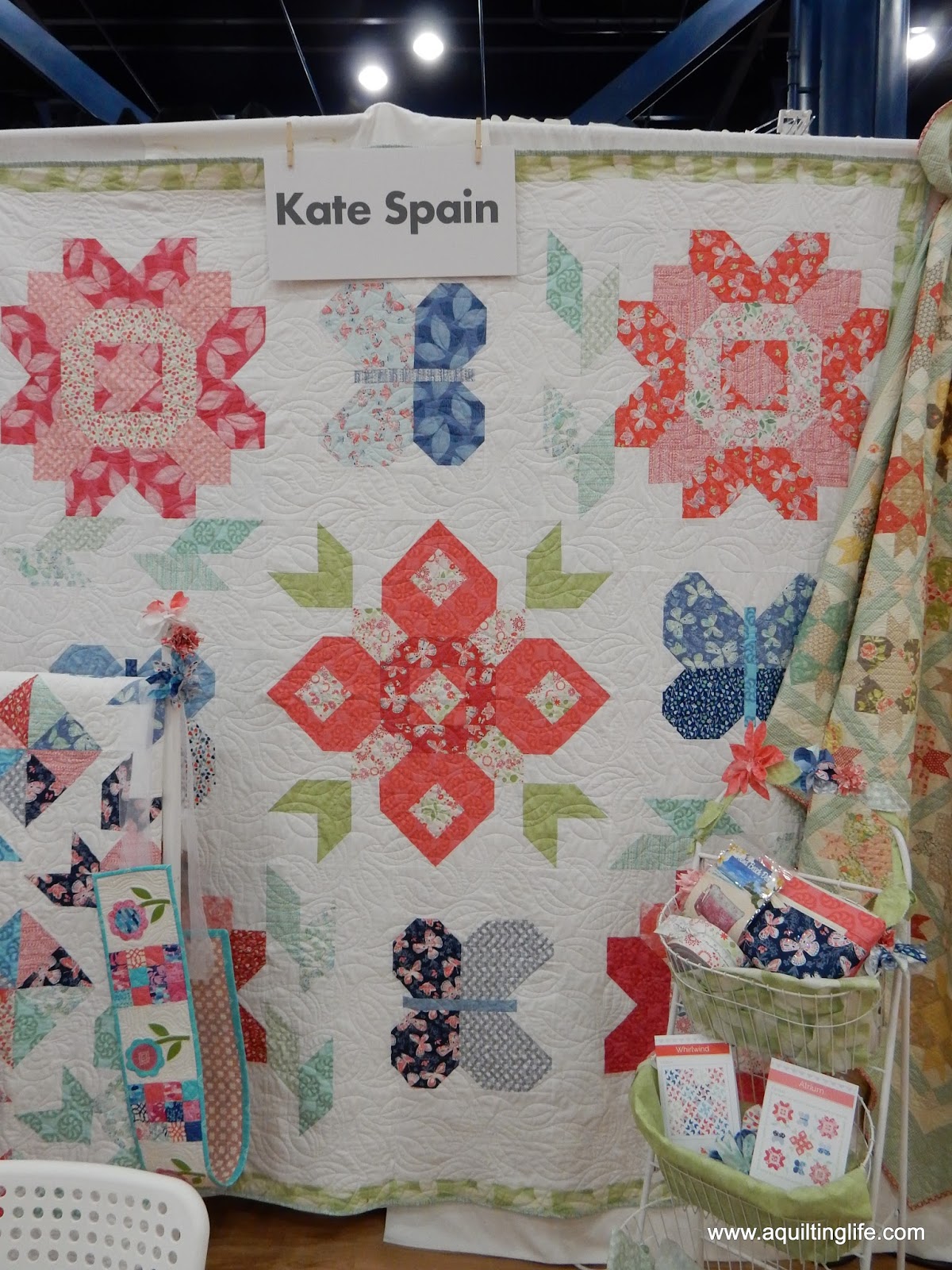 Next to Joanna’s booth was the lovely booth of Kate Spain. I love Kate’s new collection, Aria, with bright colors and beautiful florals. She had lovely quilts and lots of fun fabric flowers. She also had a mini butterfly quilt with a small version of the butterflies in the quilt below.