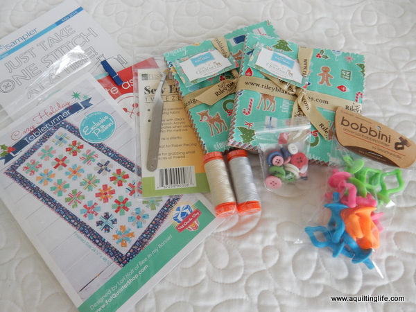 Finally, Fat Quarter Shop also has a subscription box, the Sew Sampler box. May’s box included two charm packs and a table runner pattern, sewing tweezers, thread, buttons, and some bobbini bobbin holders. The Fat Quarter Shop box also includes a pattern card with a block pattern.