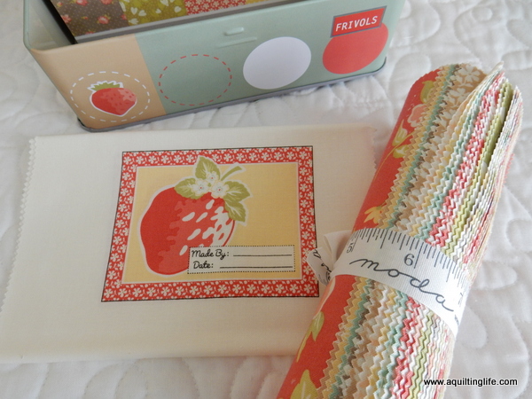 her Strawberry Fields Frivol is just about the cutest thing you’ve ever seen. Frivols are small quilt kits packaged in an adorable tin. They come with fun things inside, too. The Strawberry Fields Frivol has two quilt labels, a full-color pattern card, and of course the Strawberry Fields fabric you see pictured.