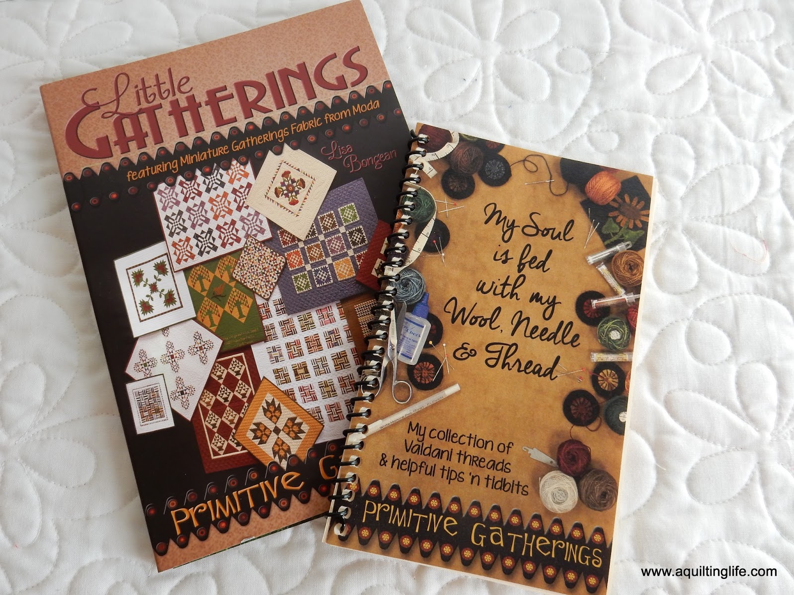 Lisa of Primitive Gatherings has two new books that were on my must-find list. I sure love mini quilts, and her Little Gatherings book has 12 miniature quilt patterns along with terrific tips and pointers. The photography is beautiful, and the projects are wonderful. I love that the book is even smaller sized: 6″ wide and 8 ยฝ″ tall. It has a spiral binding, too which makes it easy to work from.