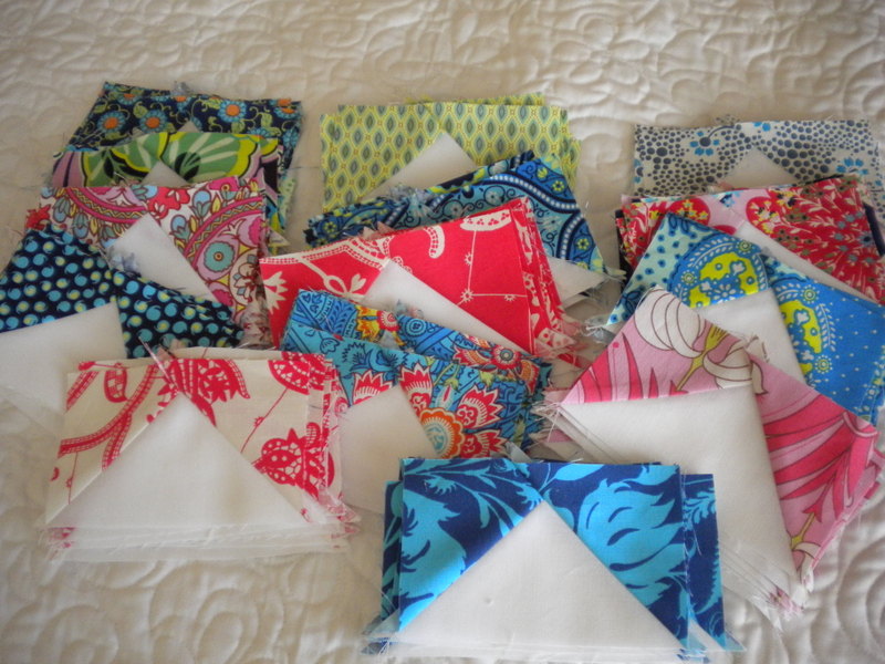 I did start a new project the other day…I raided my Amy Butler stash and started making flying geese…a lot of flying geese…112 to be exact. Now I just need to find the time to trim these. I think I have 4 of her recent lines represented here, Cameo, Lark, Gypsy Caravan, and Soul Blossoms…and they all play so well together.