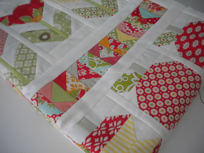 Every bit and piece of this quilt came from my scrap bins–so I guess this is technically a “free quilt.” I used five fabric collections by Bonnie & Camille for Moda–Ruby, Bliss, Vintage Modern, Marmalade, and Happy Go Lucky. The background is Moda Bella Bleached White 9900-97.
