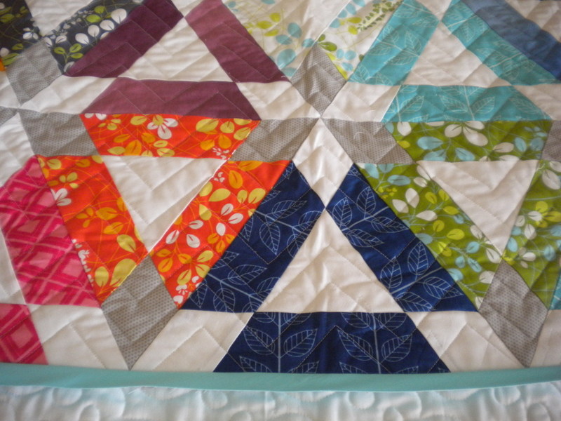 I am absolutely in love with the quilting. The chevrons keep the modern feel and yet don’t overwhelm the quilt which has a strong graphic design and is made with some pretty bold fabrics. I used the pre-made Moda Bella bias binding in aqua which seemed to be the perfect accent. I’m glad I went with a solid instead of using one of the fabrics in the quilt which might have been a little “too much.”