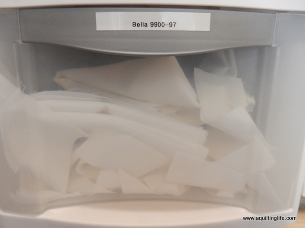 Something else I thought I could share today is how I also have been organizing the solids I use all the time. Moda Bella 9900-97 is my go-to off-white background fabric. I use it constantly and keep left-overs in a plastic drawer. I also have a separate drawer for Moda Bella Ivory 9900-60 which is my go-to creamy background. Normally I try to cut pieces from these scrap drawers before cutting yardage off of the bolt.