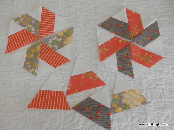Then you sew the triangle sections into half-hexagon units. The directions make it super easy to follow along and know how to line everything up. That’s all you have to do for now…in two weeks we will be putting the quilt together!