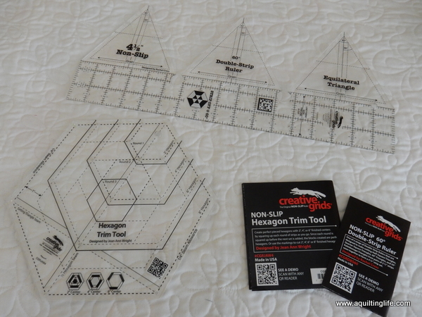 The rulers for this quilt are both new to me (Double Strip Ruler and Hexagon Trim Tool). I’m always happy with Creative Grids products, and these two have been great to work with for cutting and trimming. Kimberly gives complete directions in the video, so you won’t have any questions about how to use the rulers.