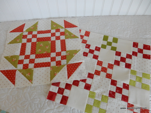 I love these green, red and cream blocks!! They are going to make a very pretty quilt.