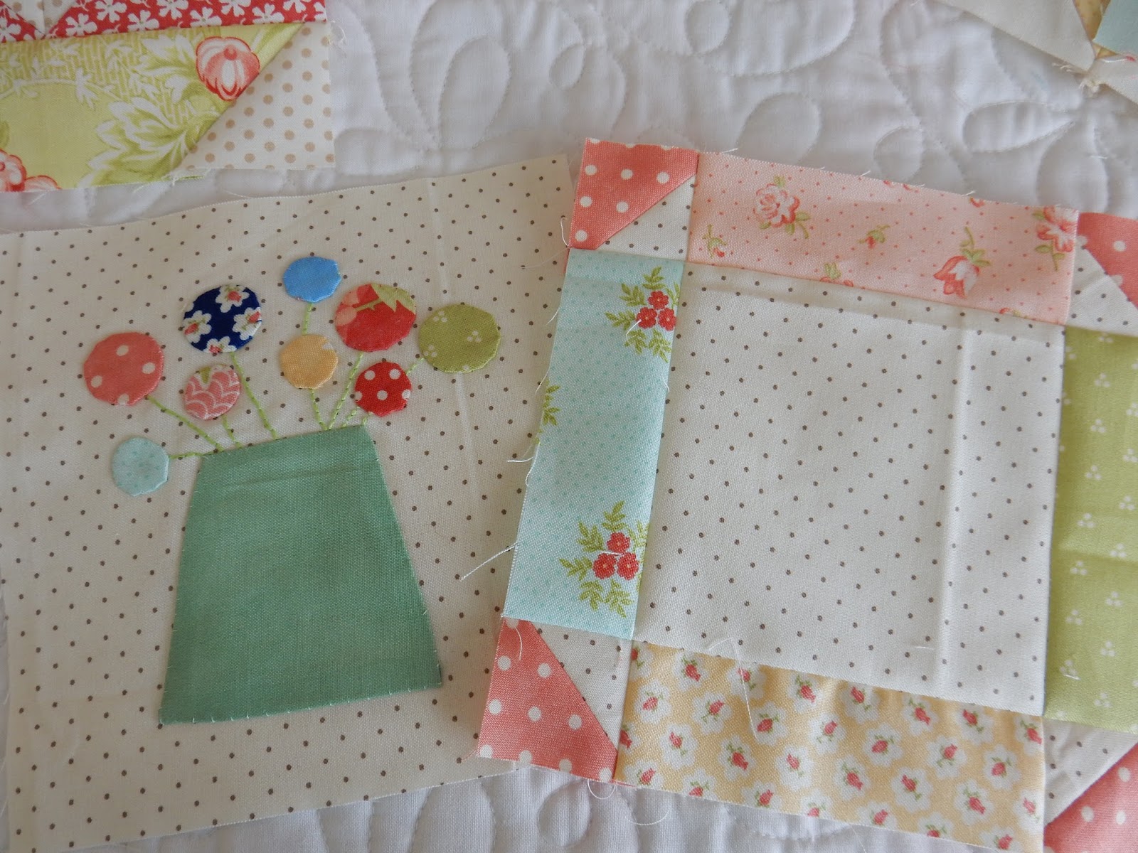 and the delicate polka dot background was perfect for the applique block and will also make a nice contrast for the embroidery (or whatever I decide to add to the center of the block on the right).