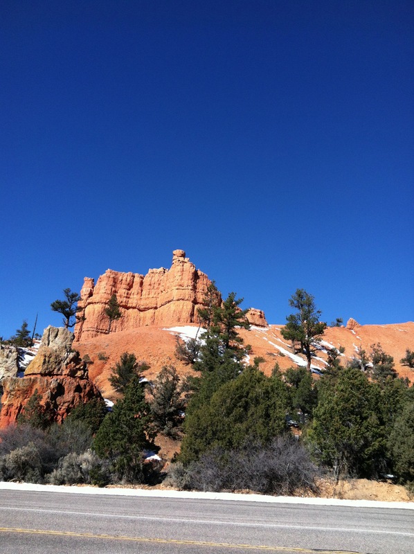 Bright and early last Wednesday morning I traveled to beautiful Bryce Canyon, Utah for a quilt retreat. I was so looking forward to a fun “working vacation” with friends and family! My sister-in-law and her sister were attending as were several of my friends. The scenery never fails to disappoint, and I had to pull over to the side of the road to take this picture with my phone. I wish I had taken a photo on the way home…it was a completely different view with everything covered in snow!