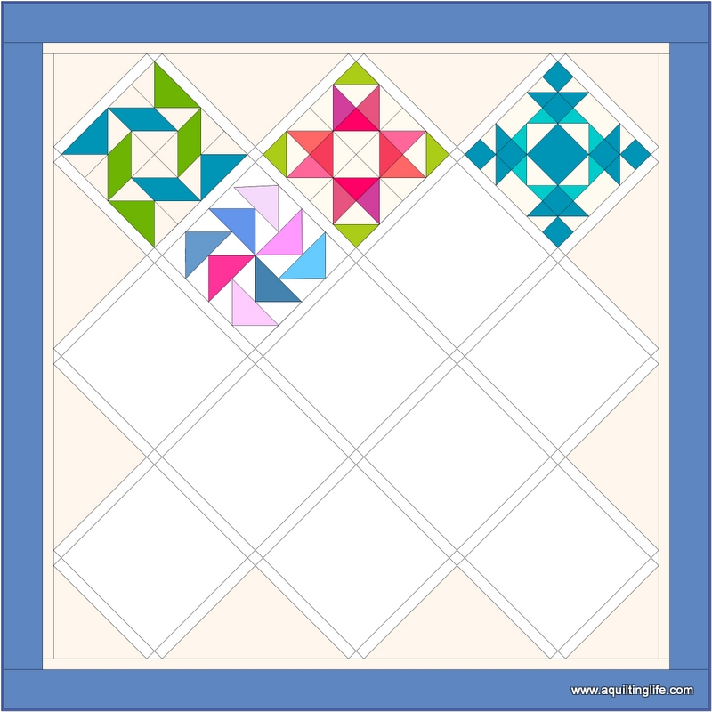 As I mentioned last month, I’ve been working on the setting options for this mystery quilt. You’ll be able to choose a straight set or on-point setting for either block size you’re working on. You might also notice that the on-point setting has 13 blocks…I’ll be providing a bonus block later in the year that you can use for this setting. I have been working on the finishing yardage amounts needed for each of the settings and will have those available for download soon.