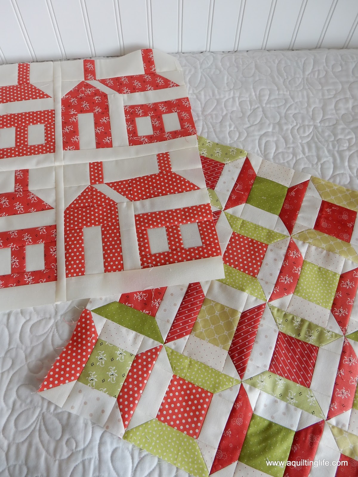 I loved being able to add in other fabrics from the previous month’s blocks. I chose to make the house blocks with just one background fabric, and I’m actually glad I did that because the fabrics for the houses are kind of busy.