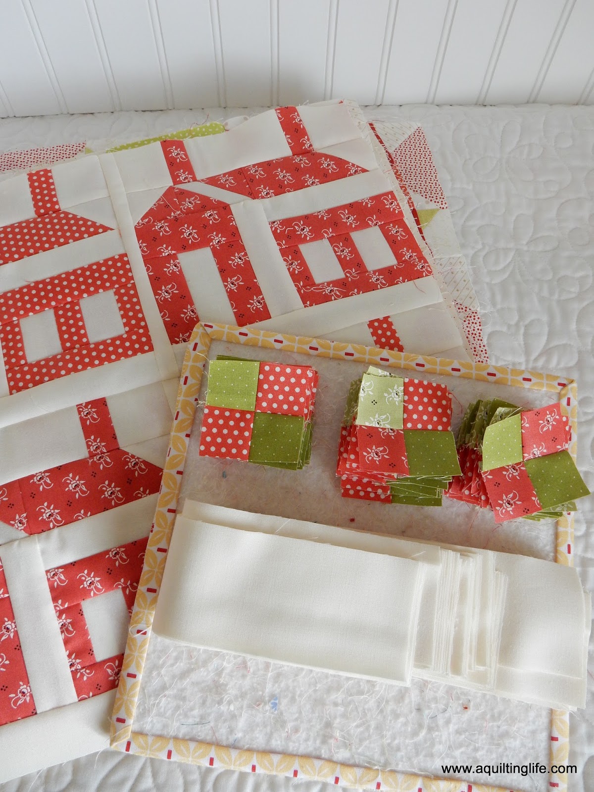 I also finished up the scrappy four-patches for the sashing posts…and I cut the sashing strips from the Bella Ivory.