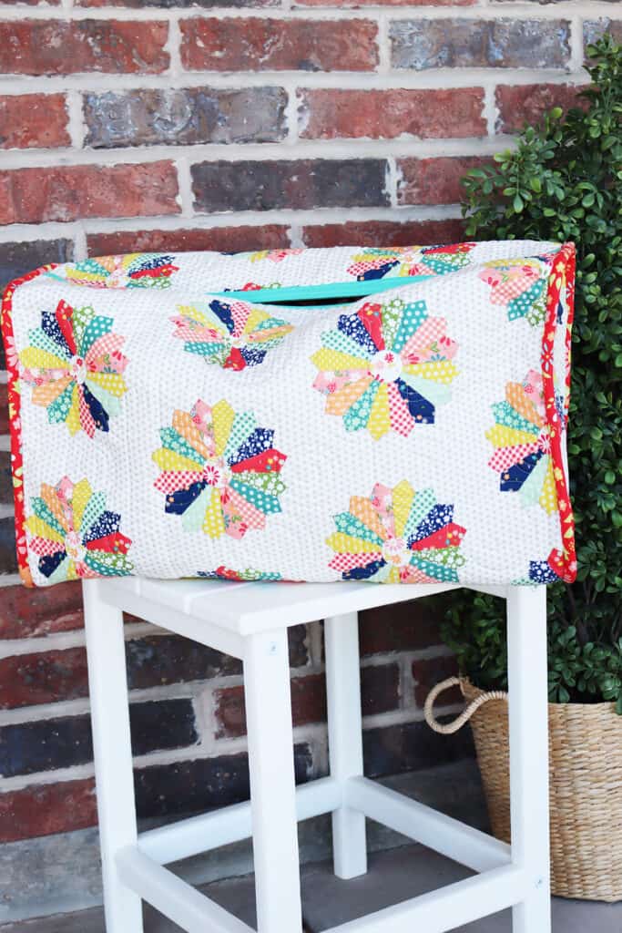 I finally made a Patchwork Duffle! I’ve had this pattern for quite a while and dug into my scraps last week to get the panels made (I used mostly Delightfully Yours, Raspberry Summer, Strawberry Lemonade, and Laguna Sunrise fabrics). I had my friend Gail do an all-over swirly pattern with my quilt sandwich: patchwork on top, Soft & Stable for stabilizer in the middle, and our Dresden cheater fabric from Raspberry Summer on the bottom. It turned out so lovely! Below find links to the pattern and the contrast fabrics I used for straps and the interior binding: