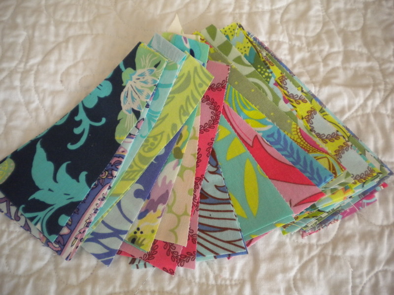 When I went to find some of the other Amy Butler fabrics I realized I hadn’t cut up the scraps from my last project. Cutting up the scraps after finishing a project is something that really saves time, helps me to keep my stash organized, and also helps me in accumulating a fabric stash for scrap quilts. While I can’t resist all the wonderful new fabrics, I truly want to make the best use of my scraps and hope to make several quilts just from scraps this year. I cut these left-overs into 5″ squares, 2 ยฝ″ strips, 1 ยฝ″ strips, and even had a couple of strings left over!