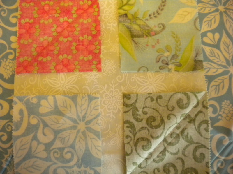 Then sew each square, right sides together, to the background square. If you enlarge the photo you should be able to see that I used the pressed line for my guide, sewing just a thread inside the pressed line.