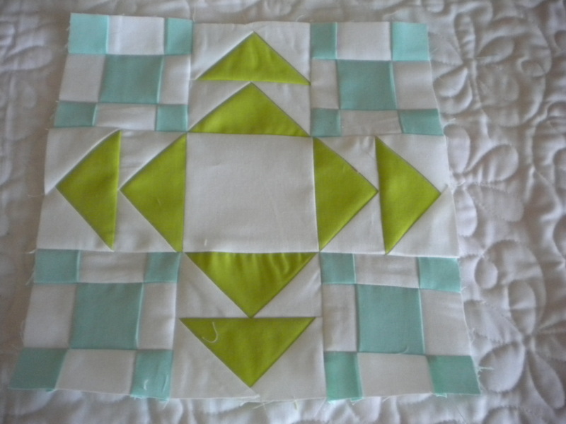 Next I made Block 24 by Jan Patek. I used Moda Bella Summer House Lime (9900 173) and Moda Bella Aqua (9900 34). You can get the pdf pattern here. I’m using Moda Bella bleached white (9900 97) for my background fabrics.