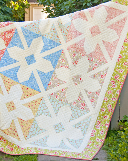 I can finally share some of my “secret sewing” of recent weeks. Today, Joanna revealed one of her new designs, “Star Blooms.” I was lucky to be able to make two versions of this quilt (made with two different block sizes). Pictured here is the 20” block version made with California Girl by Joanna Figueroa for Moda.