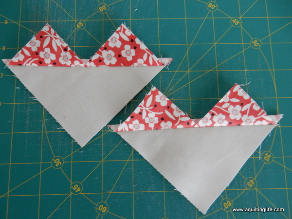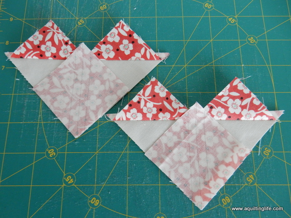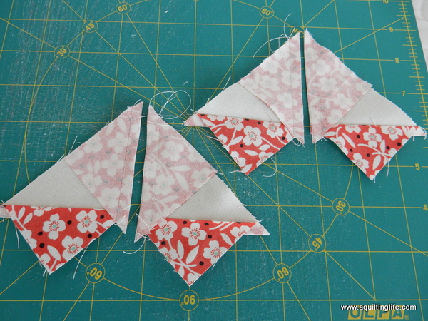 Press toward the print fabrics. You now have four flying geese units (2″ x 3 ยฝ″ unfinished) for your star block. I trimmed off the “dog-ear” corners and extra threads.