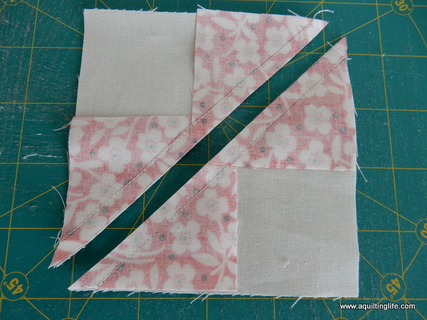 Take the remaining two print squares with drawn lines and place them on the units as shown. You will again stitch on the two outer lines of each unit.