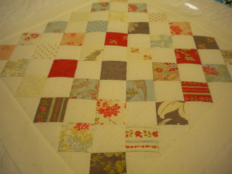 For the four-block method you will choose 9 print fabrics for each block and lay out alternating with background squares. Repeat four times so that you have four blocks put together in pleasing color combinations. You will have 4 print fabrics left over…save these for the border corner posts.