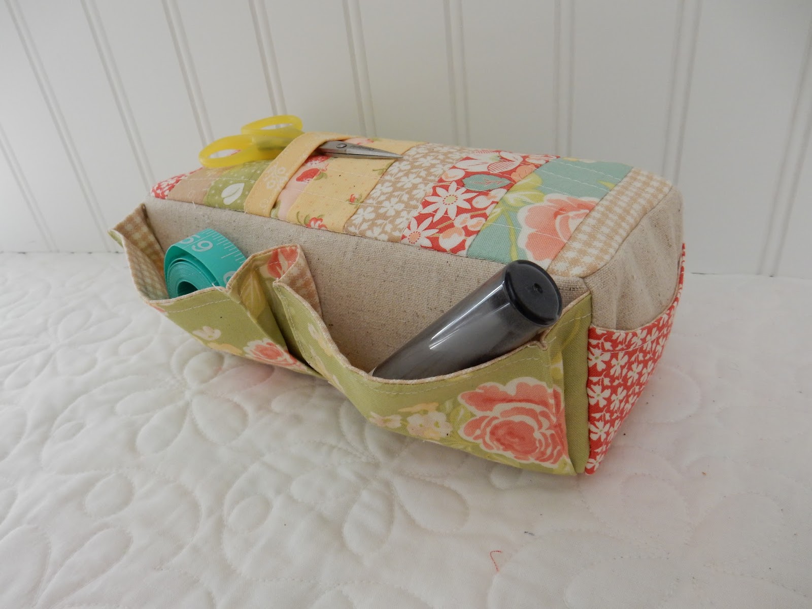 This is a good-sized pincushion…about 4″ tall, 4″ wide, and 9″ long. It’s substantial enough to sit on a table or take to a class…you’ll be able to find it easily. And…it has nifty pockets everywhere that are especially handy for keeping things close at hand.