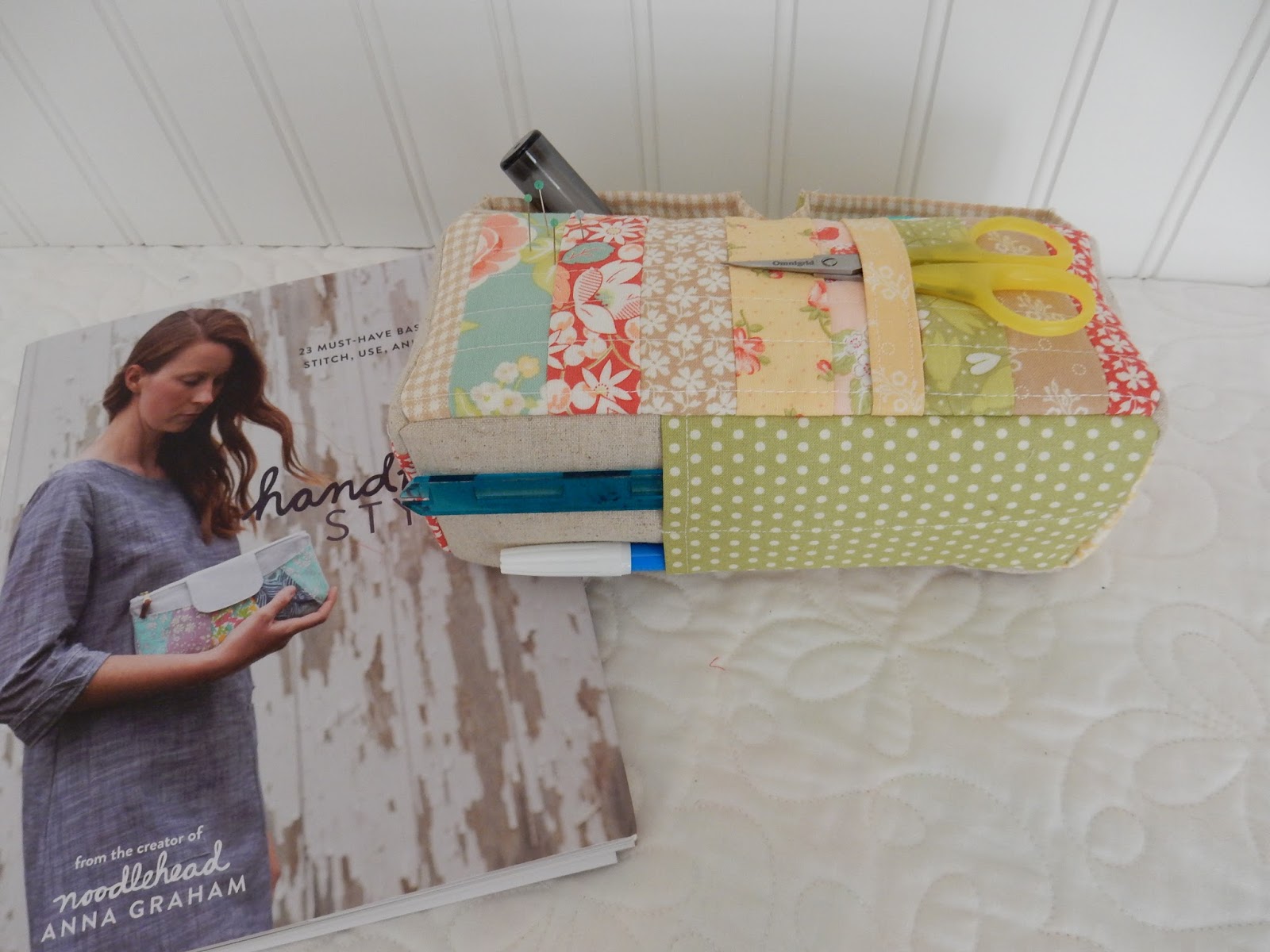 Another thing I did a little differently was to add some straight line quilting to the top of my pincushion–it just seems to give a little more body to the top and make it better for pins. The pincushion is stuffed with a combination of crushed walnut shells and cotton stuffing. I used Anna’s suggestion for enclosing the walnut shells in a separate pouch which is then placed inside the pincushion .