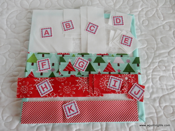 I used a mix of two different Kate Spain Christmas collections, some Bella solid, and the stripe from Scrumptious for my block. Alphabitties from Fat Quarter Shop make it easy to find the pieces after they’ve been cut out.