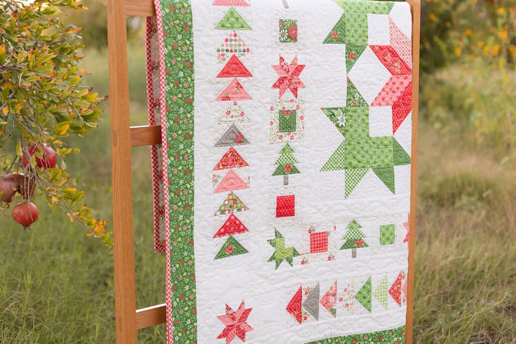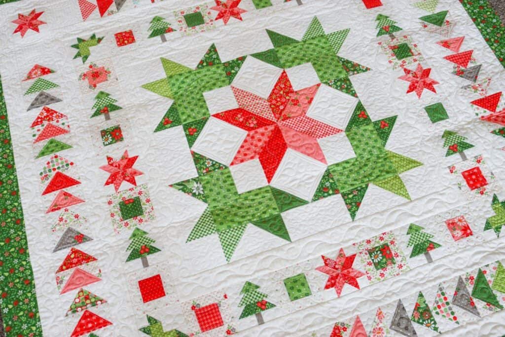 Hello, friends! Today I’m sharing my new Wreath & Pine Quilt + Table Topper with our upcoming Poinsettia & Pear fabric collection. It was super fun to design this medallion quilt, and I love the table topper version as well. Keep reading for all of the details.